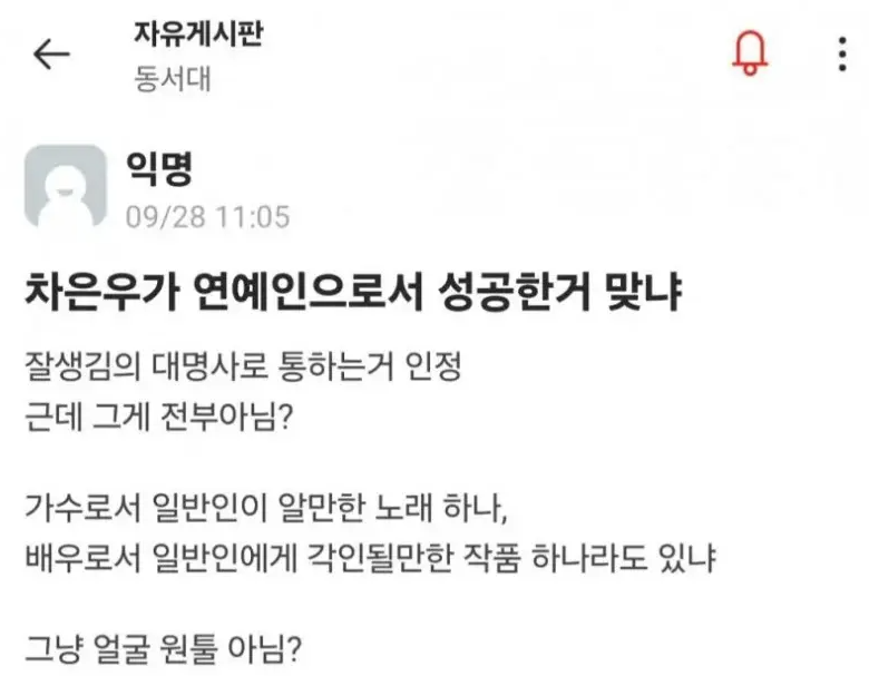 차은우가 연예인으로서 성공한게 맞냐는 에타인