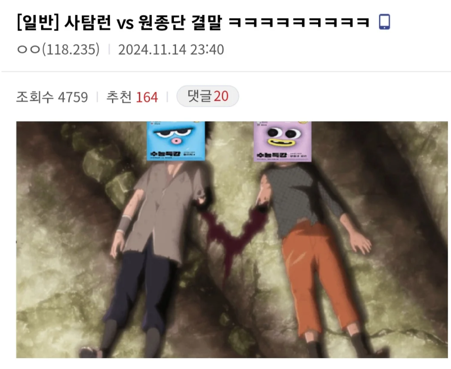 결국 사탐러너들과 과탐1(원) 응시생들 모두 멸망하고 화해하는 결말을 맞이했다고 ㅋㅋㅋㅋㅋㅋㅋㅋㅋㅋ