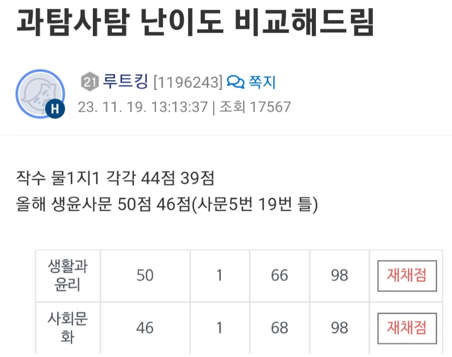 그중에서도 가장 꿀통이라는 생활과 윤리라는 과목에 많은 과탐러들이 사탐런을하기 시작했음.